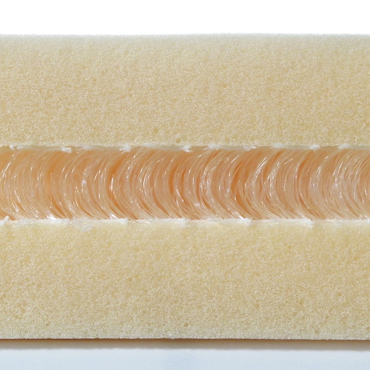 スポーツシューズの側生地と同様の、立体的なクッション繊維をウレタンの間に挟みこむことで、ウレタンがつぶれ切らず、適度な反発力を維持します。